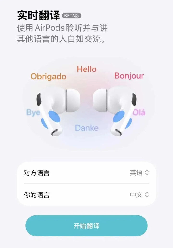 该功能使得AirPods佩戴者在与外语者交谈时,可将对方的语言翻译成你自己的语言;当对话双方均佩戴兼容AirPods时,还可实现实时互译。